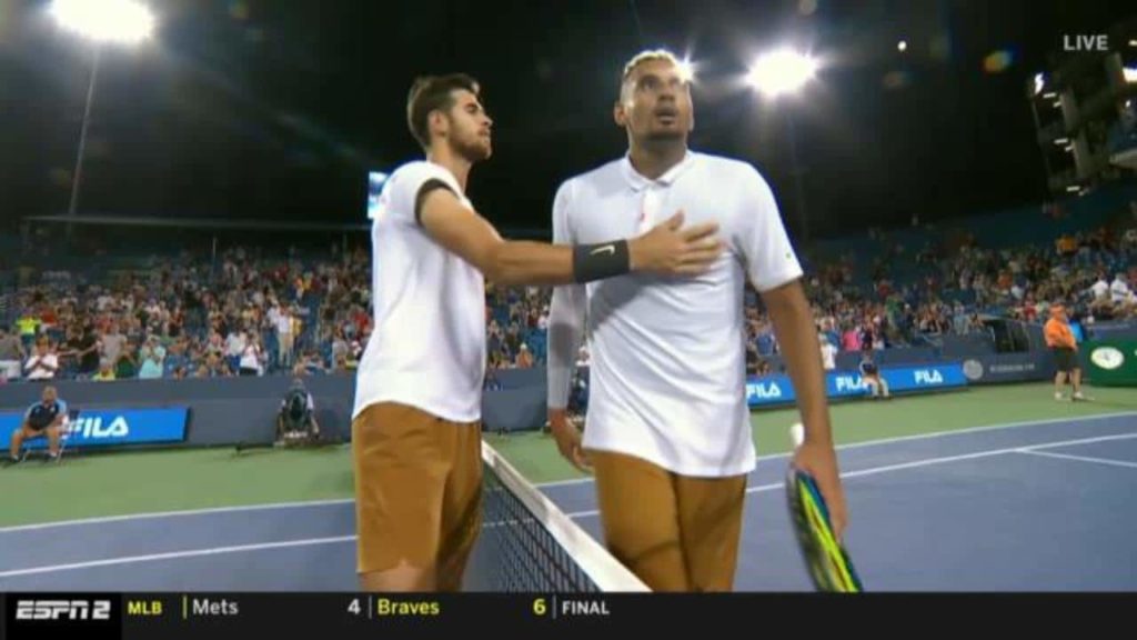 A világranglista 27. helyén álló játékos a Khachanov elleni mérkőzésén többször is konfrontálódott a székbíróval, Fergus Murphy-vel. Először időtúllépés miatt kapott figyelmeztetést, amitől begurult, és minősíthetetlen jelzőkkel illette a véleménye szerinti “legrosszabb játékvezetőt a világon”. Kyrgios úgy véli, nem történt volna figyelmeztetés, ha például Rafael Nadal követ  el hasonló vétséget. Murphy akkor húzott ki egy újabb gyufát, mikor nem engedélyezett mosdószünetet Kyrgios-nak, aki erre válaszul összetört két ütőt a pálya szélén.